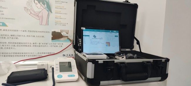 除了SH-T17智能健康一體機,健康中心也配置了SH-202便攜式健康一體機,SH-202便攜式健康體檢一體機是上禾針對基層公衛(wèi)推出的一款便攜式公共衛(wèi)生檢測設(shè)備,可以通過平板電腦等數(shù)據(jù)采集終端和數(shù)據(jù)管理軟件系統(tǒng)實現(xiàn)一體化整合,實現(xiàn)心電圖、心率、血糖、血壓、血氧飽和度、尿常規(guī)、體溫等多種參數(shù)檢測,快速建立居民電子健康檔案,與信息管理平臺或健康檔案管理系統(tǒng)進行數(shù)據(jù)交互傳輸,可上傳或成批次/單獨下載調(diào)用數(shù)據(jù),并提供接口開發(fā)包,支持將采集到的健康數(shù)據(jù)上傳至區(qū)域信息平臺或健康檔案管理系統(tǒng)。